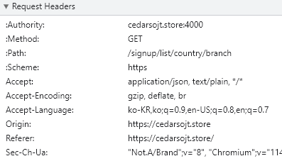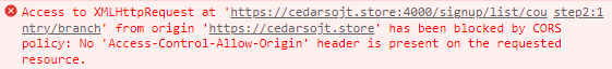 Access to XMLHttpRequest at 'https://cedarsojt.store:4000/signup/list/country/branch' from origin 'https://cedarsojt.store' has been blocked by CORS policy: No 'Access-Control-Allow-Origin' header is present on the requested resource.